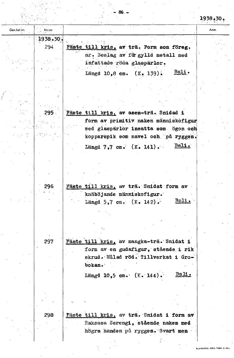 - 86 - 1938 .30 294 Fäste till kris, av trä. Form som föreg. nr. Beslag av fl& gylld metall med infattade röda glaspärlor. Längd 10,8 cm. (K. 139). Bali. 29 'Fäste till kris, av asem-trä. Snidad i form av primitiv naken människofig med glaspärlor insatta som ögon °c kopparspik som navel och. på ryggen Längd 7.7 cm. (K. 141).' 24512. 296 Fäste till kris, av trä. Snidat form av knäböjande människofigur.- Längd 5,7 cm. (K. 142). Bali. 297 Fäste till kris, av nangka-trä.'Snidat i form av en gudafigur, stående, i rik skrud. Målad röd.' Tillverkat i Gro- bokan. Längd 10,5 cm.' (K.'144).' Bali. 298 Fäste till kris, av trä. Snidat i form av Raksasa Serengi, stående naken med högra handen på ryggen. Svart men [ocr]