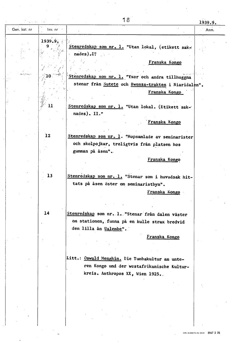 1 8 1939.9. 1939.9. 9 Stenredskap som nr. 1. "Utan lokal, (etikett saks nades),IU Franska Kongo 'Stenredskap som nr. 1. "Yxor och andra tillhuggna stenar från Sutete och Bwenza-trakten i Niaridal n". Franska Kongo - Stenredskap som nr. 1. "Utan lokal. (Etikett sak-- nades). II." 'Franska Kongo 12 Stenredskap som nr. 1. "Hopsamlade av seminarister och skolpojkar, troligtvis från platsen hos gumman på åsen". Franska Kongo 13 Stenredskap som nr. 1. "Stenar som i huvudsak hit- tats på åsen öster om seminaristbyn". Franska Kongo 14 Stenredskap som nr.,1.."Stenar från dalen väster om stationen, funna på en kulle strax bredvid den lilla ån Ualembe". Franska,Kongo Litt.: Oswald Menghin. Die Tumbakultur am unte- ren Kongo und der westafrikanische Kultur- kreis. Anthropos XX, Wien 1925., [ocr]