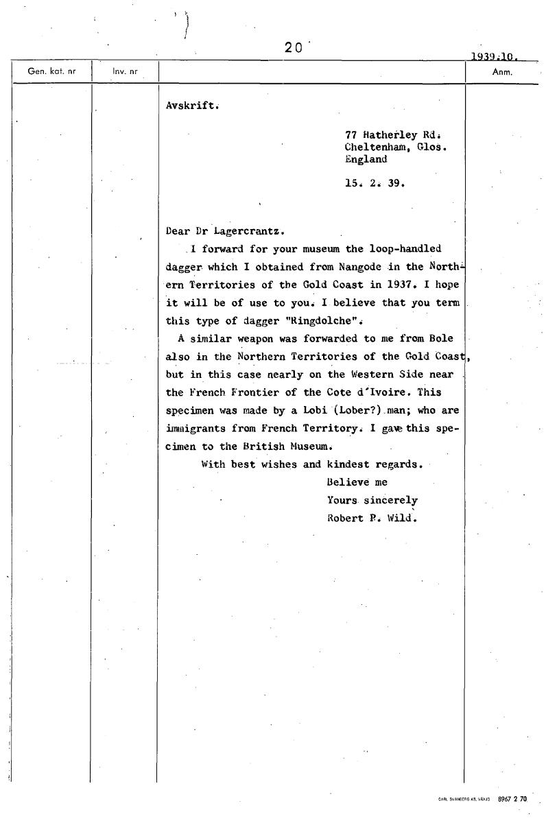 20' 1939.10 Avskrift. 77 Hatherley Rd. Cheltenhaffi, Glos. England 15. 2. 39. Dear Dr Lagercrantz. .I forward for your museum the loop-handled dagger which I obtained from Nangode in the North- ern Territories of the Gold Coast in 1937. I hope it will be of use to you: I believe that you term this type of dagger "Ringdolche": A similar weapon was forwarded to me from Bole also in the Northern Territories of the Gold Coas but in this case nearly on the Western Side near . the French Frontier of the Cote d'Ivoire. This specimen was made by a Lobi'(Lober?).man; who are immigrants from French Territory: I gaw this spe- cimen to the British Museum. With best wishes and kindest regards. Believe me Yours sincerely Robert P. Wild. [ocr]Stäng