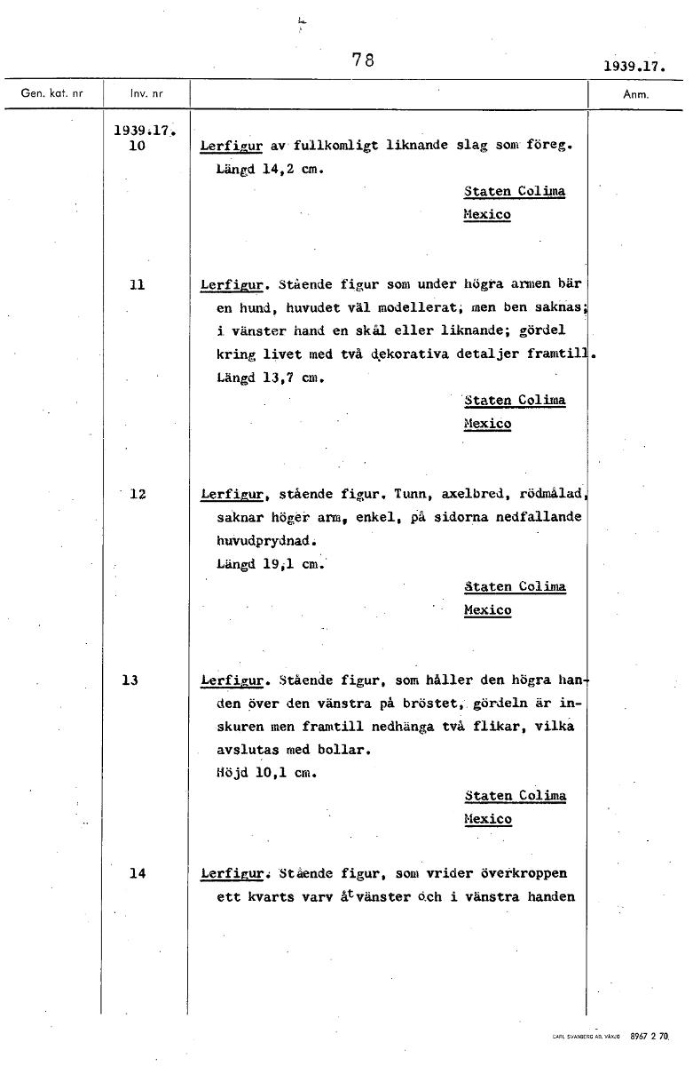78 1939.17. 1939.17:. 10 Lerfigur av fullkomligt liknande slag som föreg. Längd 14,2 cm. Staten Colima Mexico 11 Lerfigur. Stående figur som under högra armen bär en hund, huvudet vål modellerat, men ...