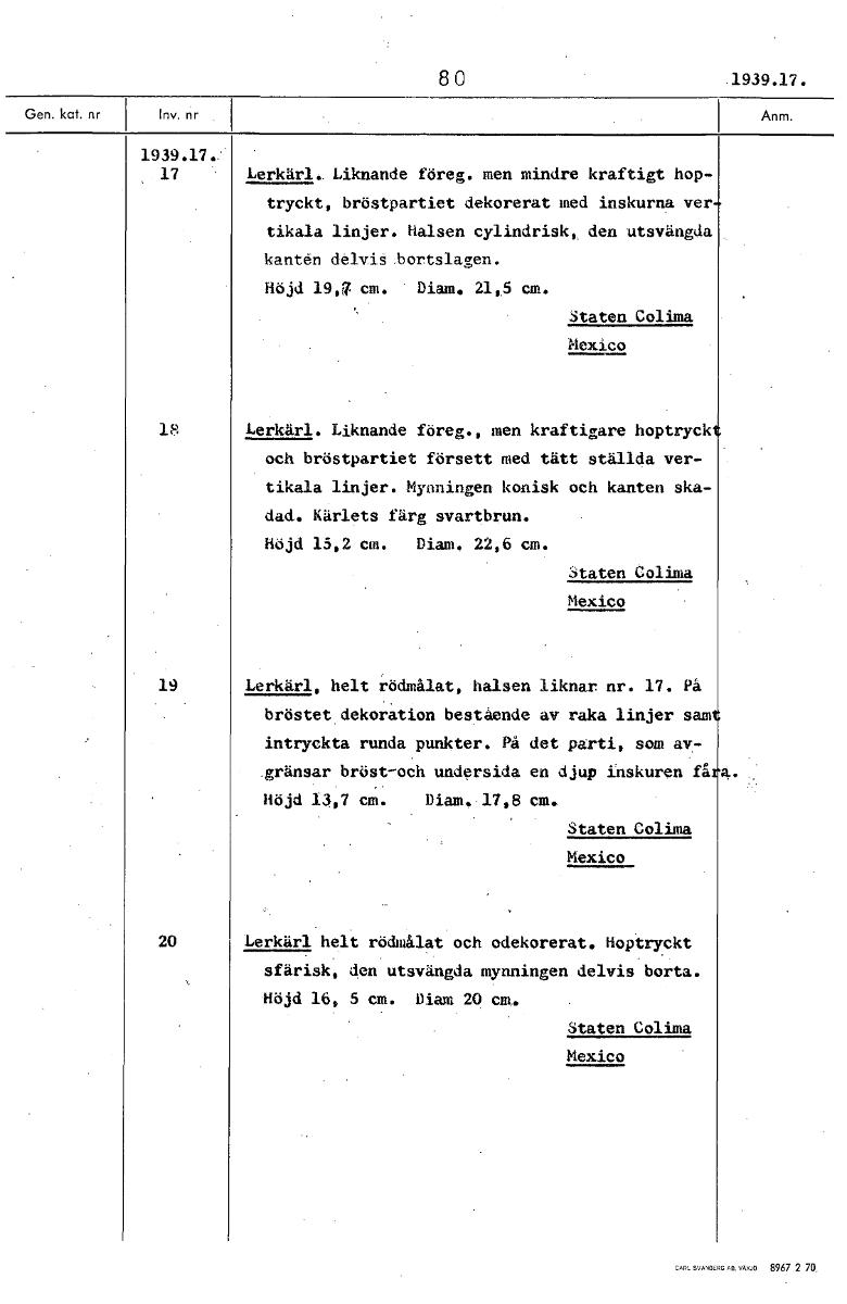 8 0 1939.17. 1939.17.: 17 Lerkärl. Liknande föreg. men mindre kraftigt hop- tryckt, bröstpartiet dekorerat med inskurna ver tikala linjer. Halsen cylindrisk, den utsvängda kanten delvis bortslagen. Höjd 19,7 cm. Diam. 21 ,,5 Staten Colima Mexico 18 Lerkärl. Liknande föreg., men kraftigare hoptryck och bröstpartiet försett med tätt ställda ver- tikala linjer. Mynningen konisk och kanten ska- dad. Kärlets färg svartbrun. Höjd 13,2 cm. Diam. 22,6 cm. staten Colima Mexico 19 Lerkärl, helt rödmålat, halsen liknar nr. 17. På bröstet dekoration bestående av raka linjer sam intryckta runda punkter. På det parti, som av- gränsar bröst-och undersida en djup inskuren få a. Höjd 13,7 cm. Diam. 17,8 cm. Staten Colima Mexico 20 Lerkärl helt rödmålat och odekorerat. Hoptryckt sfärisk, den utsvängda mynningen delvis borta. Höjd 16, 5 cm. Diam 20 cm. Staten Colima Mexico [ocr]