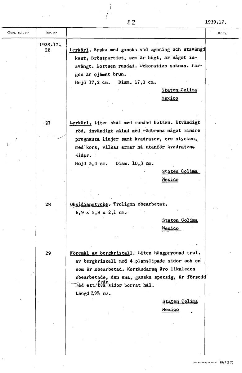 82 1939.17. 1939.17, 26 Lerkärl,' Kruka med ganska vid mynning och utsvängd kant; Bröstpartiet, som är högt, är något in- svängt. Bottnen rundad. Dekoration saknas. Fär- gen är ojämnt brun. Höjd 17,2 cm. Diam.. 17,1 cm. Staten,-Colima Mexico 27 Lerkärl. Liten skål med rundad botten. Utvändigt röd, invändigt målad med rödbruna något mindre pregnanta linjer samt kvadrater, tre stycken, med kors, vilkas armar nå utanför kvadratens ålder. Höjd 5,4 cm. Diam. 10,3 cm. Staten Colima Mexico 28 Obsidianstuke. Troligen obearbetat. 6,9 x 5,8 x 2,1 cm. Staten Colima Mexico 29 Föremål av bergkristall. Liten hängprydnad trol. av bergkristall med 4.planslipade sidor och eh som är obearbetad. Kortändarnq äro likaledes obearbetade, den ena, ganska spetsig, är förled ined ett/ta från sidor borrat hål. Längd cm. Staten Colima Mexico [ocr]