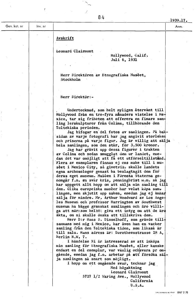 • 8 4 1939.17. Avskrift Leonard Clairmont Hollywood, •Calif Juli 6, 1931 Herr Direktören av Etnografiska Museet, Stockholm Herr Direktör:- Undertecknad, som helt nyligen återvänt till Hollywood frän ent... Visa hela