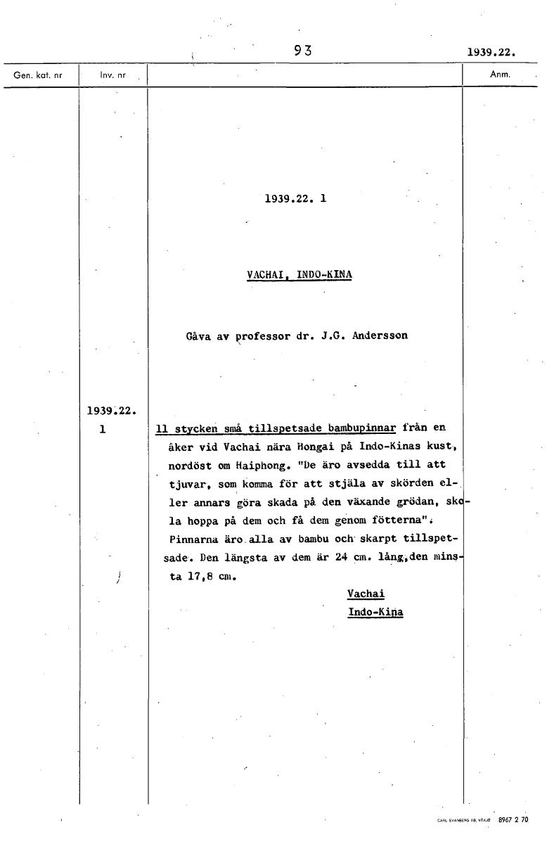 • 93 1939.22. 1939.22. 1 VACHAI, INDO-KINA Gåva av professor dr. J.G. Andersson 1939.22. 1 11 stycken små tillspetsade bambupinnar från en åker vid Vachai nära Hongai på Indo-Kinas kust, nordöst om Haip... Visa hela
