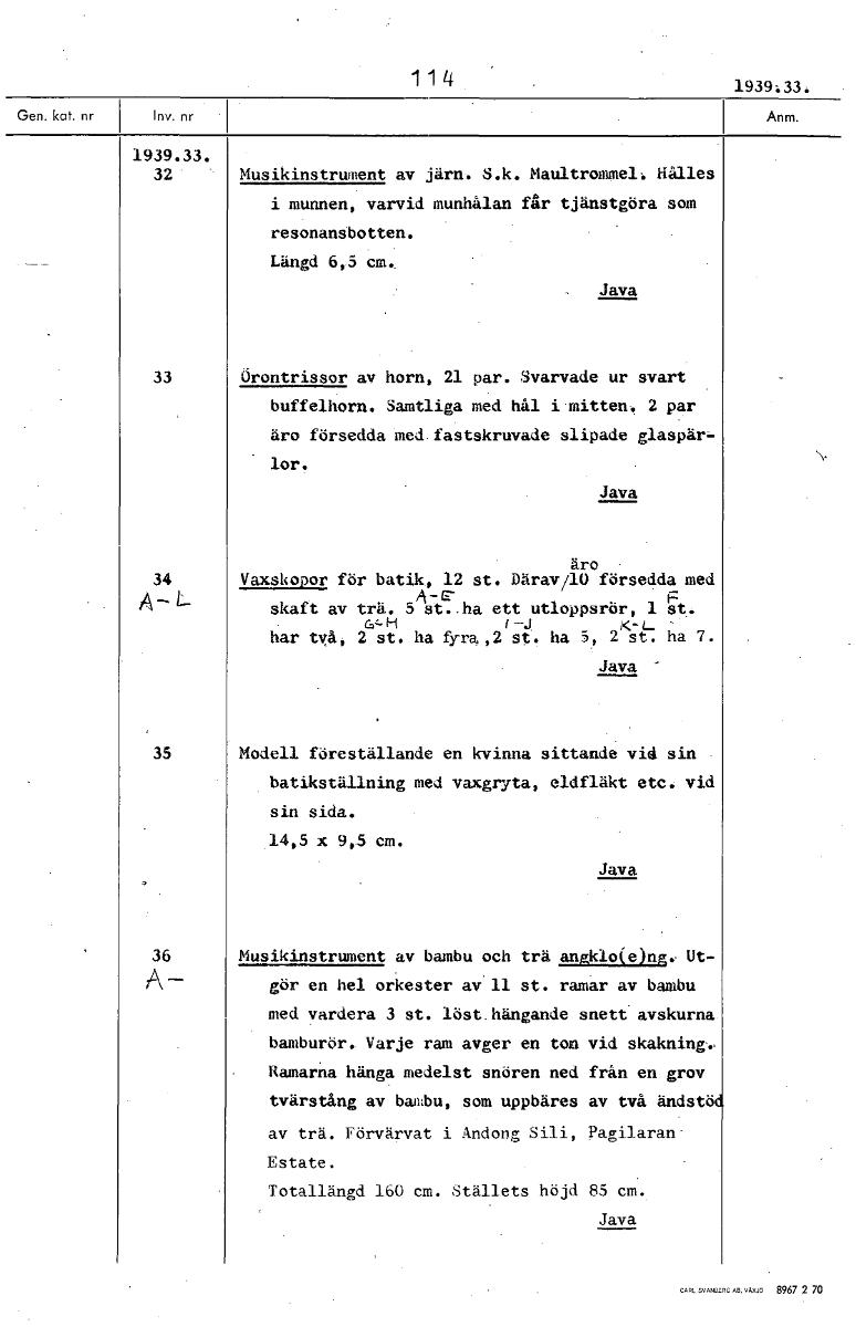 • 1 1 4 1939133. 1939.33. 32 Musikinstrument av järn. S.k. Maultrommel. Hålles i munnen, varvid munhålan får tjänstgöra som resonansbotten. Längd 6,5 cm, Java 33 Örontrissor av horn, 21 par. Svarvade ur... Visa hela