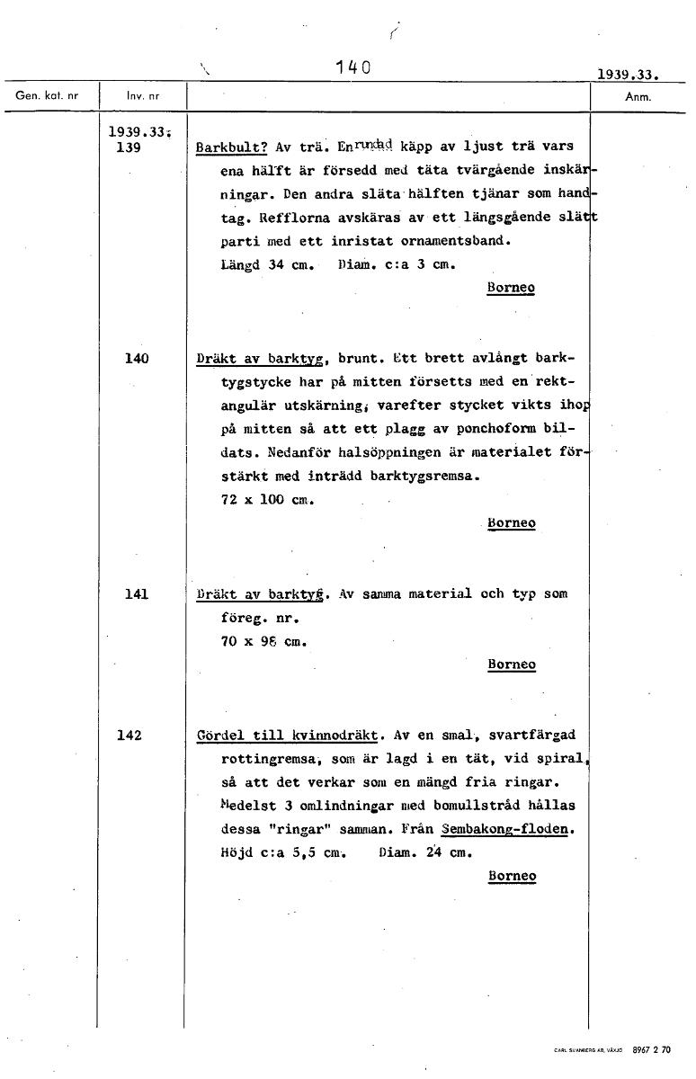 140 1939.33. 1939.33. 139 Barkbult? Av trä. Enrux.10 käpp av ljust trä vars ena hälft är försedd med täta tvärgående inskä ningar. Den andra släta hälften tjänar som han tag. Refflorna avskäras av ett längsgående slät parti med ett inristat ornamentsband. Längd 34 cm. Diam. c:a 3 cm. Borneo 140 Dräkt av barktyg, brunt. Ett brett avlångt bark- tygstycke har på mitten försetts med en rekt- angulär utskärning; varefter stycket vikts iho på mitten så att ett plagg av ponchoform bil- dats. Nedanför halsöppningen är materialet för stärkt med inträdd barktygsremsa. 72 x 100 cm. Borneo 141 Dräkt av barktyg. Av samma material och typ som föreg. nr. 70 x 98 cm. Borneo 142 Gördel till kvinnodräkt. Av en smal, svartfärgad rottingremsa, som är lagd i en tät, vid spiral så att det verkar som en mängd fria ringar. Medelst 3 omlindningar med bomullstråd hållas dessa "ringar" samman. Från Sembakong-floden. Höjd c:a 5,5 cm. Diam. 24 cm. Borneo [ocr]Stäng