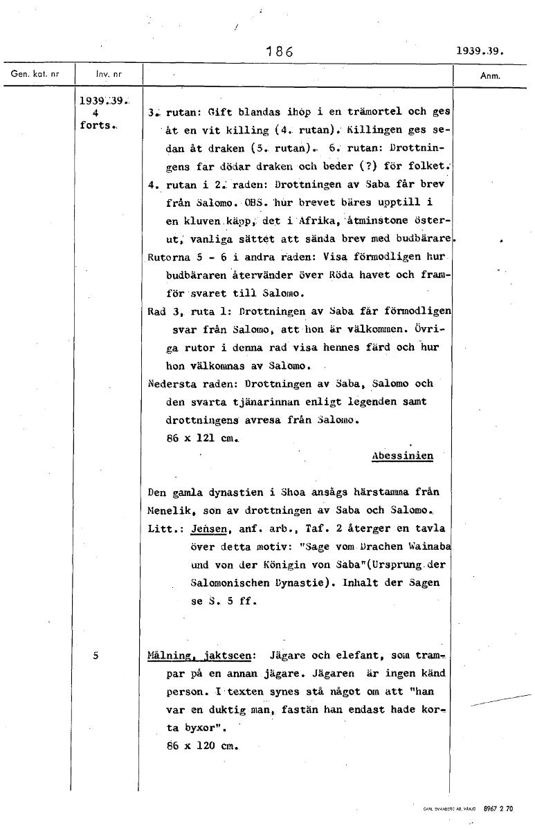 186 1939.39. 1939.39:, 4 3., rutan: Gift blandas ihop i en trämortel och ges forts., åt en vit killing (4: rutan): Killingen ges se- dan åt draken (5: rutan).. 6: rutan: Drottnin- gens far dödar draken och beder (?) för folket; 4. rutan i 2.. raden: Drottningen av Saba får brev från Salomo. OBS. hår brevet bäres upptill i en klåven.käpp, det i'Afrikai'åtminatone öster- ut; vanliga sättet att sända brev med budbärare .Rutorna 5 - 6 i andra raden: Visa förmodligen hur_ budbärarenåtervänder över Röda havet och fram- för svaret till Salomo. Rad 3,. ruta 1: Drottningen av Saba får förmodligen svar från Salomo, att hon är välkommen. Övri- ga rutor i denna rad visa hennes färd och hur hon välkomnas av Salm°. Nedersta raden: Drottningen av Saba, Salomo och den svarta tjänarinnan enligt legenden samt drottningens avresa från Salomo. 86 x 121 cm. Abessinien Den gamla dynastien i Shoa ansågs härstamma från Menelik, son av drottningen av Saba och Salomo. Litt.: Jensen, anf. arb., Taf. 2 återger en tavla över detta motiv: "Sage vom Drachen Wainab und von der Königin von Saba"(Ursprång der Salomonischen Dynastie). Inhalt der Sagen se S. 5 ff. Målning, jaktscen: Jägare och elefant, som tram, par på en annan jägare. Jägaren är ingen känd person.•I texten synes stå något om att "han var en duktig man, fastän han endast hade kor, ta byxor". 86 x 120 cm. [ocr]