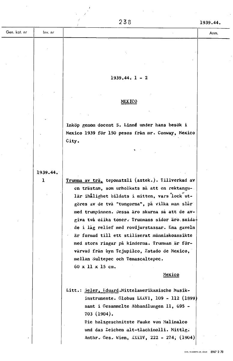 • 238 1939.44. 1939.44. 1 - 2 MEXICO Inköp genom docent S. Linné under hans besök i Mexico 1939 för 150 pesos från mr. Conway, Mexico City. 1939.44. 1 Trumma av trät teponatzli (aztek.). Tillverkad av e... Visa hela