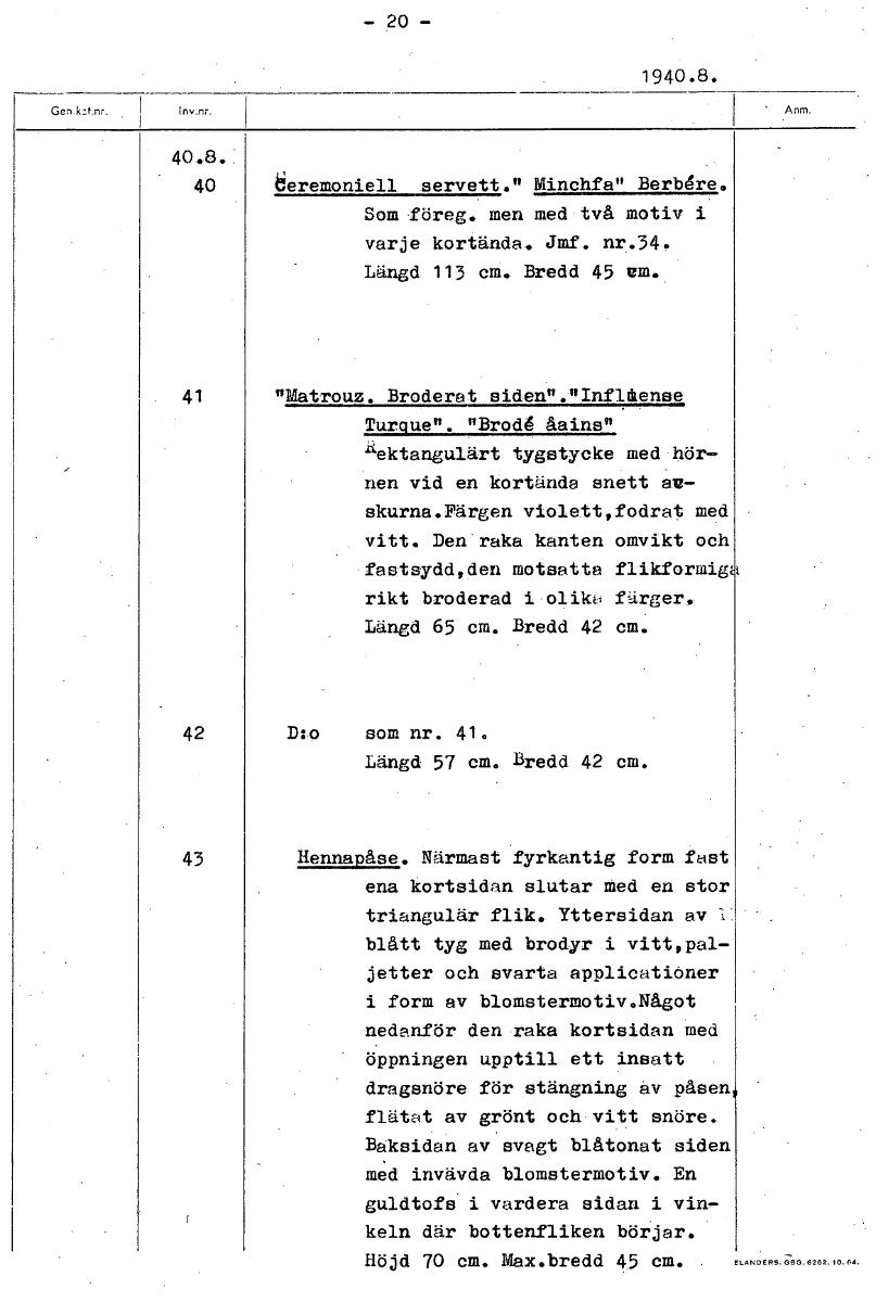 -20- 1940.8. 40.8. 40 deremoniell servett." Minchfa" Berbdre. Som föreg. men med två motiv i varje kortända. Jmf. nr.34. Längd 113 cm. Bredd 45 em. 41 "Matrouz. Broderat siden"."Inflåense Turpue". "Br...Visa hela