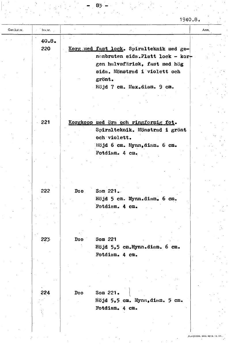 1940.8. 40.8. 220 Korg med fast lock. Spiralteknik med ge- ncmbruten sida.Platt lock - kor gen halvsfärisk, faut med hög sida. Mönstrad i violett och grönt. Röjd 7 cm. Max.diam. 9. om. 221 Korgkopp med öra och ringformig fot. Spiralteknik. Mönstrad i grönt och violett. Böjd 6 cm. Mynn,diam. 6 cm. Potdiam. 4 cm. 222 D:o Som 221._ Höjd 5 cm. Mynn4diam. 6 cm. Potdiam. 4 cm. 223 D:o Som 221 Höjd 5,5 em.Mynn.diam. 6 cm. Potdiam. 4 om. 224 D:o Som 221. Höjd 5,5 Mynn di m. 5 cm. Potdiam. 4 cia. [ocr]Stäng