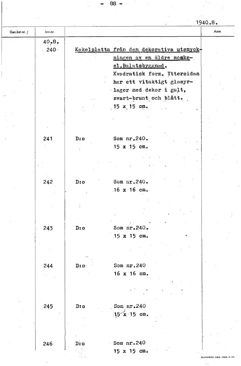 • 88 1940.8. 40.8 240' Kakelplatta från den dekorativa utsmyckningen av en äldre moské- el. palatsbyggnad. Kvadratisk form. Yttersidan har ett vitaktigt glasyr- lager med dekor •i gult, svart-brunt och ... Visa hela