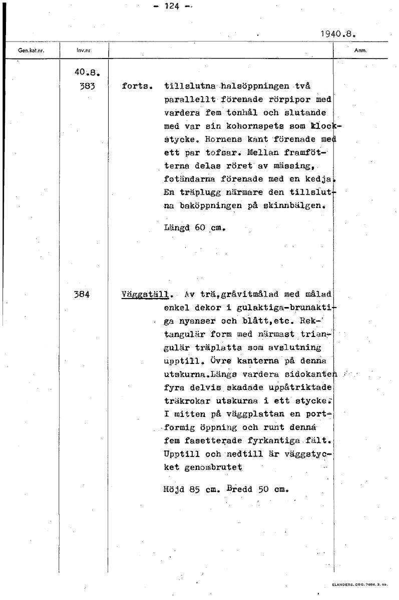 - 124 -- 1940.8. 40.8. 383 forts. tillslutna,halsöppningen två parallellt förenade rörpipor med vardera fem tonhål och slutande med var sin kohornspets som kloc stycke. Hornens kant förenade me ett par tofsar. Mellan framföt- terna delas röret av mässing, fotändarna förenade med en kedja En träplugg närmare den tillslut •na baköppningen på skinnbälgen. längd 60 ,cm. 384 Vägställ. Av trä,gråvitmålad med målad enkel dekor i gulaktiga-brunakti ga nyanser och blåttletc. Rek-' tangulär form med närmasttrian7 gulär träplatta som avslutning upptill. Övre kanterna på denåa utskurna.längs vardera sidokante fyra delvis skadade uppåtriktade träkrokar utskurna i ett stycke: I mitten på väggplattan en port., -formig öppning och runt denna fem fasetterade fyrkantiga fält. Upptill och nedtillär väggstyc- ket genombrutet Höjd 85 cm. Bredd 50 cm. [ocr]Stäng