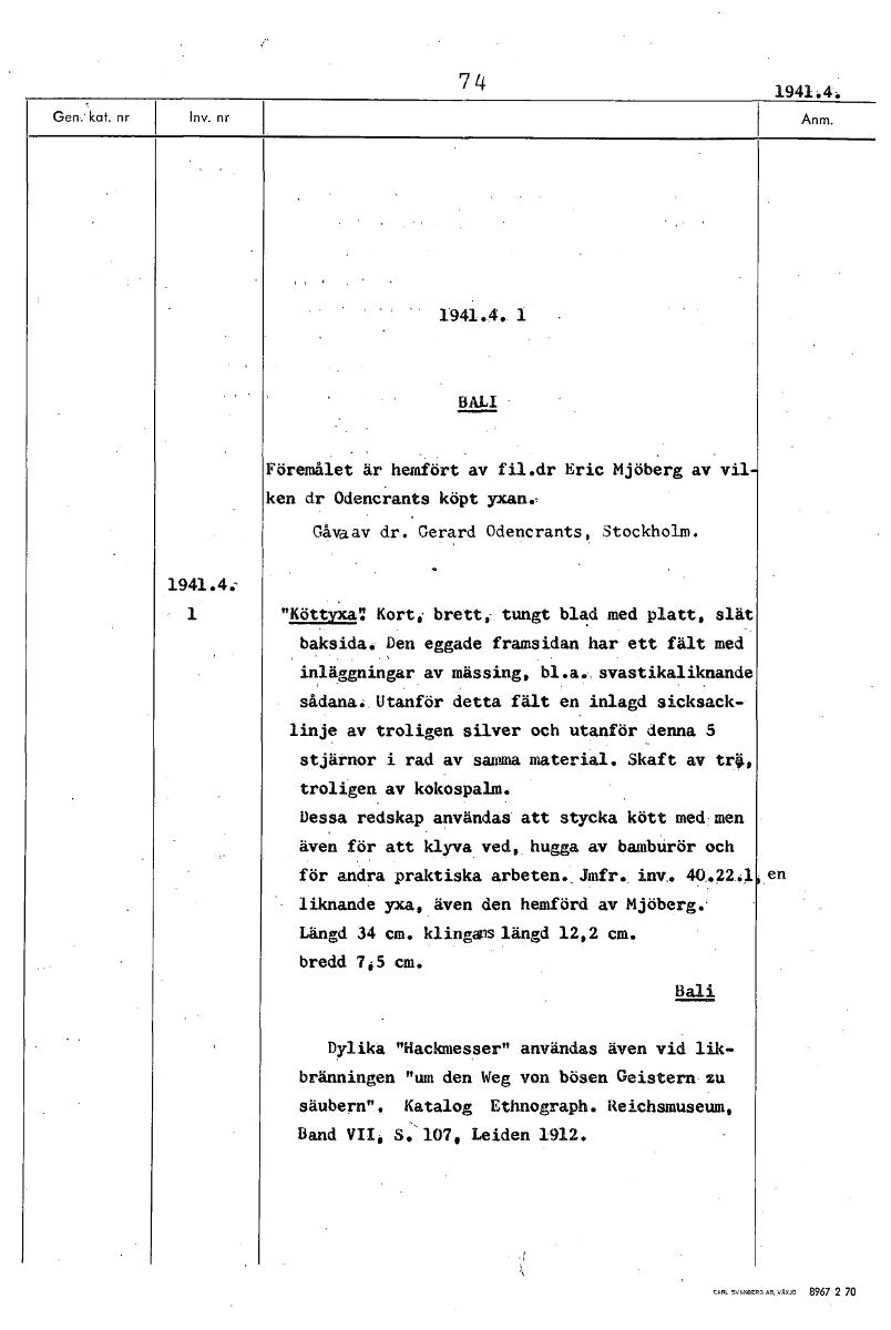 74 1941.4. 1941.4.. 1 BALI Föremålet är hemfört av fil.dr Eric Mjöberg av vil ken dr Odencrants köpt yxan.- Gåva av dr. Gerard Odencrants, Stockholm. 1941.4. 1 "Köttyxa; Kort, brett,- tungt blad med p...