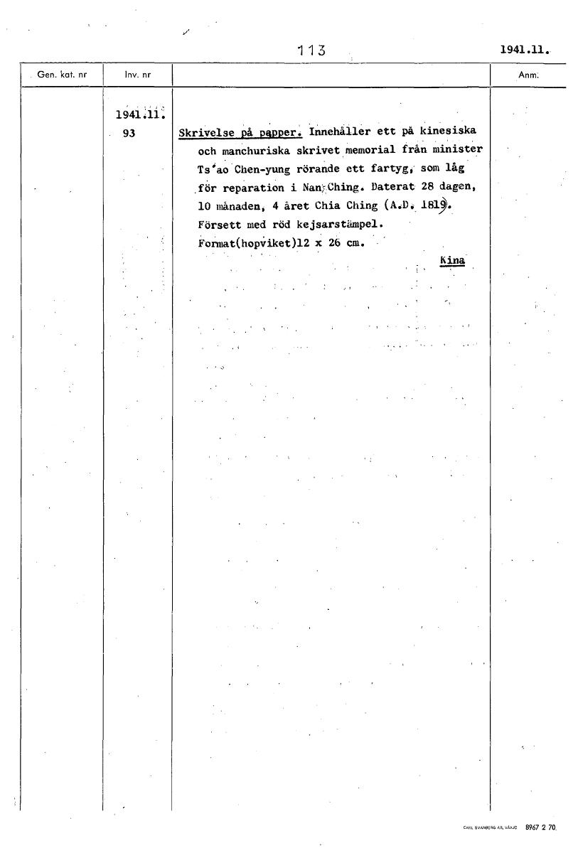 • 113 1941.11. 1941.11: 93 Skrivelse på papper. Innehåller ett på kinesiska och manchuriska skrivet memorial från minister Ts'ao Chen-yung rörande ett fartyg, som låg för reparation i Nan.Ching. Daterat... Visa hela