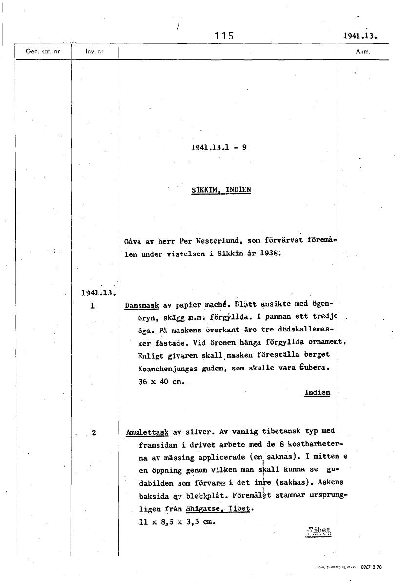 1 1 5 194415., 1941.13..1 - 9 SIKKIM. INDIEN Gåva av herr Per Westerlund, som förvärvat föremå len under vistelsen i Sikkim år 1938. 1941.13. 1 Dansmask av papier mach6 Blått ansikte med ögon- bryn, skägg m.m. förgyllda. I pannan ett tredj öga. På maskens överkant äro tre dödskallemas- ker fästade. Vid öronen hänga förgyllda orname t. Enligt givaren skall,masken föreställa berget Koanchenjungas gudom, som skulle vara eubera. 36 x 40 cm. Indien Amulettask av silver. Av vanlig tibetansk typ med framsidan i drivet arbete med de 8 kostbarhete na av mässing applicerade (en saknas). I mitteg e en öppning genom vilken man skall kunna se gu dabilden som förvaras i det inre (saknas). Aske s baksida qv bletkplåt. Föremål‘t stammar urspru g- ligen från Shigatse, Tibet. 11 x 8,5 x 3,5 cm. .Tibet [ocr]