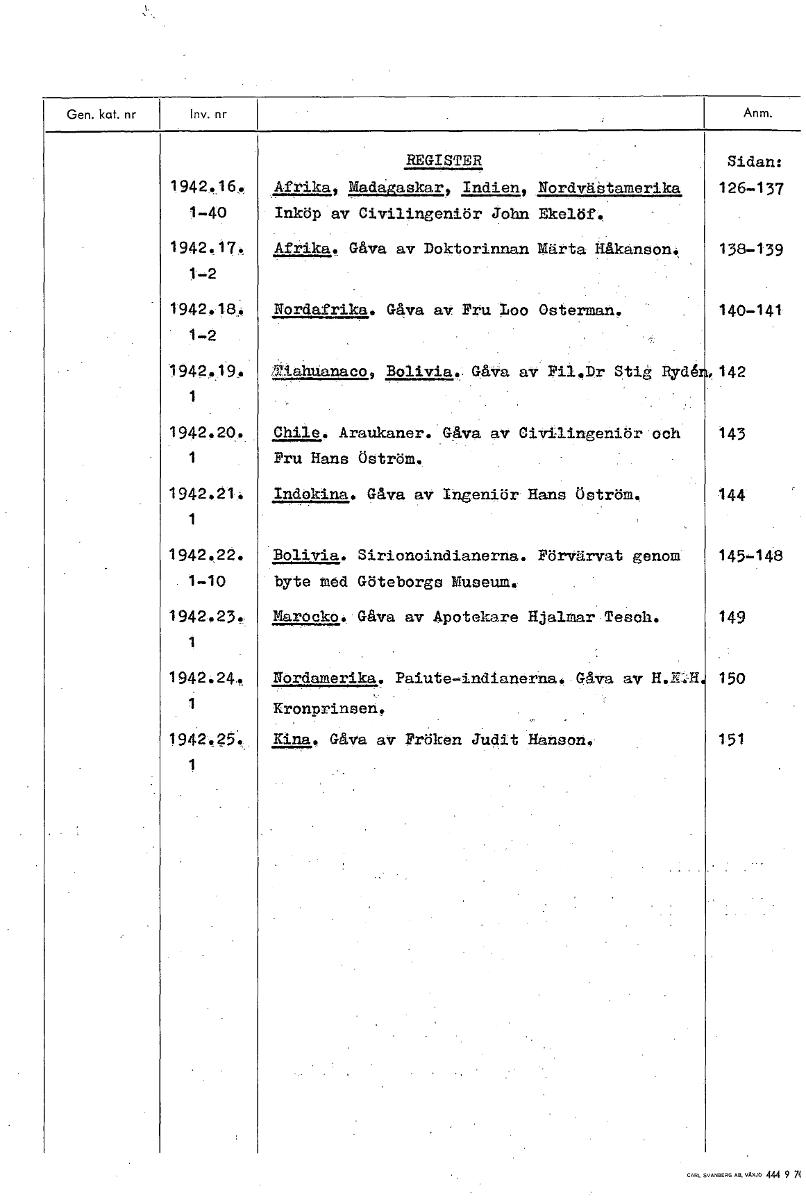 REGISTER Sidan: 1942.16,, Afrika, Madagaskar, Indien, Nordvästamerika 126-137 1-40 Inköp av Civilingenjör John Ekelöfs 1942.17. Afrika. Gåva av Doktorinnan Märta Håkanson. 138-139 1-2 1942.18ft Nordaf...