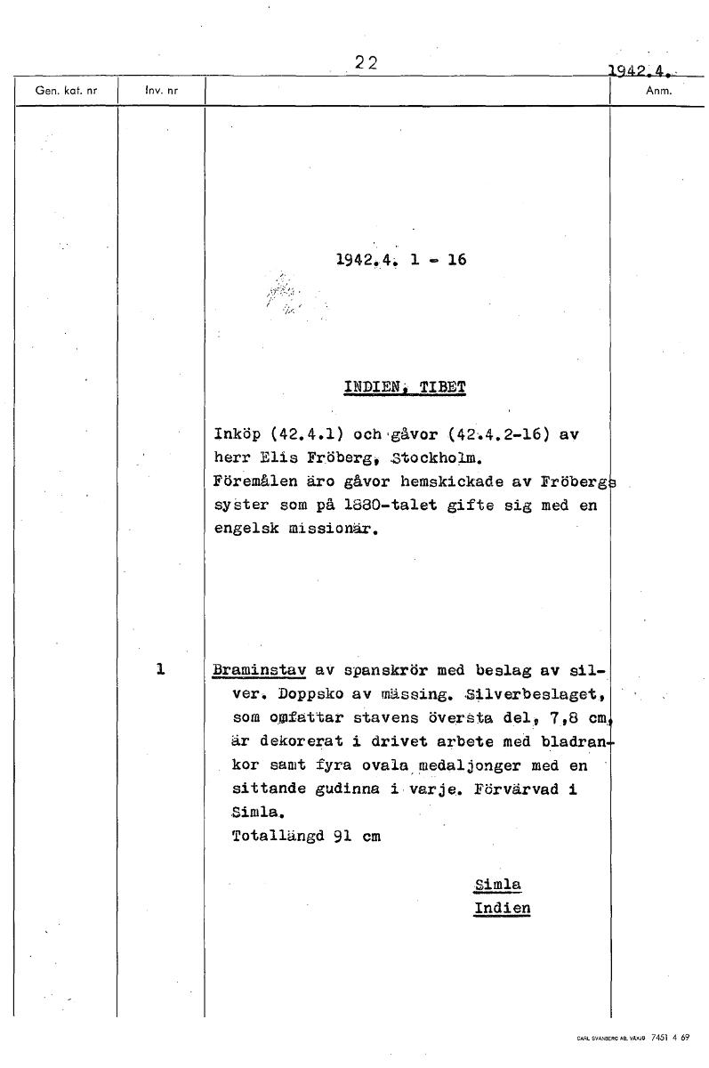 • 22 1942-4.: 1942.4. 1 - 16 INDIEN, TIBET Inköp (42.4.1) och gåvor (42.4.2-16) av herr Elis Fröberg, Stockholm. Föremålen äro gåvor hemskickade av Fröberg syster som på 1880-talet gifte sig med en enge... Visa hela