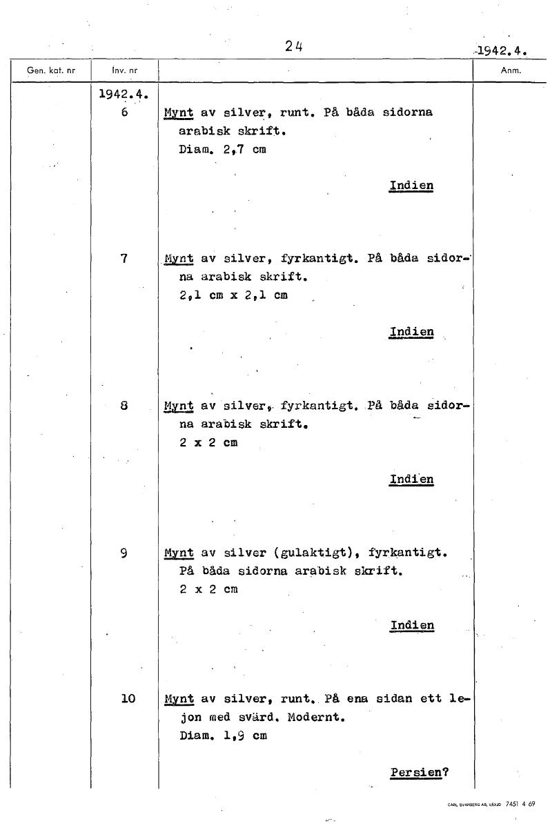 24 .1942.4. 1942.4. 6 Mynt av silver, runt. På båda sidorna arabisk skrift. Diam. 2,7 cm Indien 7 Mynt av silver, fyrkantigt. På båda sidor- na arabisk skrift. 2,1 cm x 2,1 cm Indien 8 fixaI av silver...