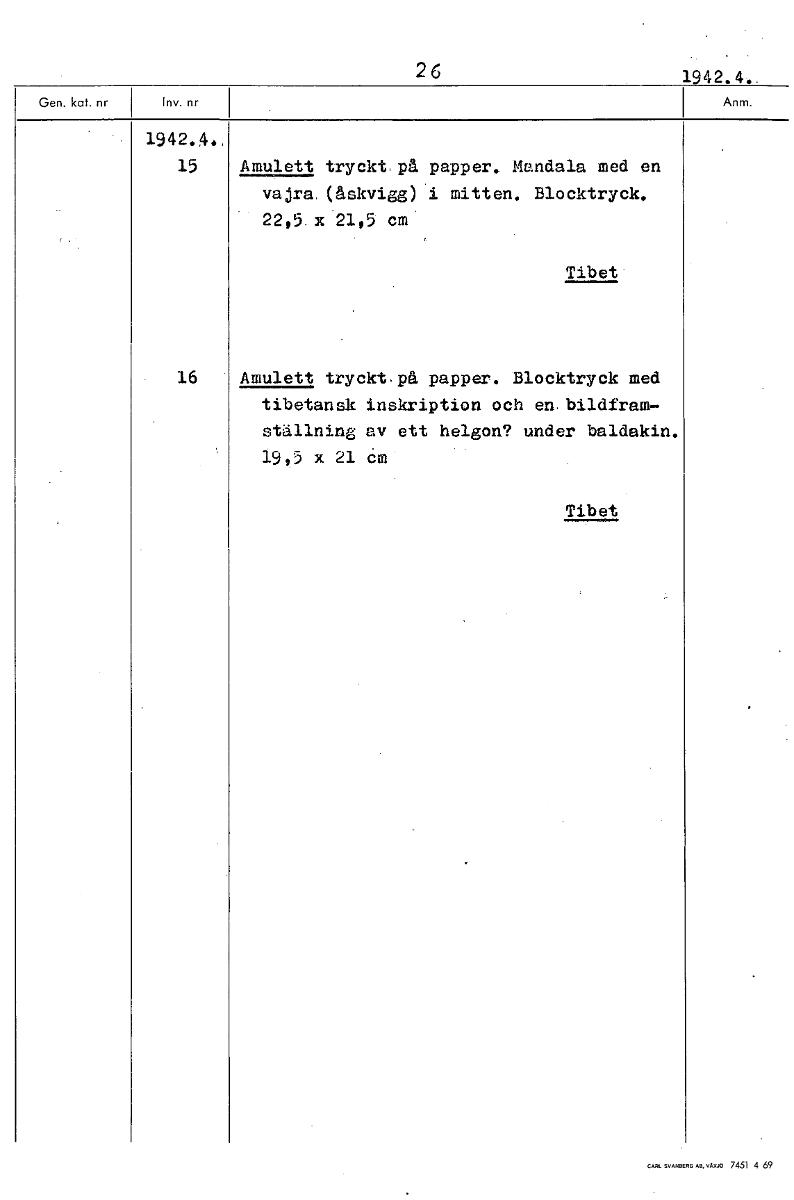 26 1942.4., 1942.4., 15 Amulett tryckt, på papper. Mandala med en vajra.(åskvigg) i mitten. Blocktryck. 22,5. x 21,5 cm Tibet 16 Amulett tryckt,på papper. Blocktryck med tibetansk inskription och en. bildfram- ställning av ett helgon? under baldakin. 19,E x 21 Cm Tibet [ocr]