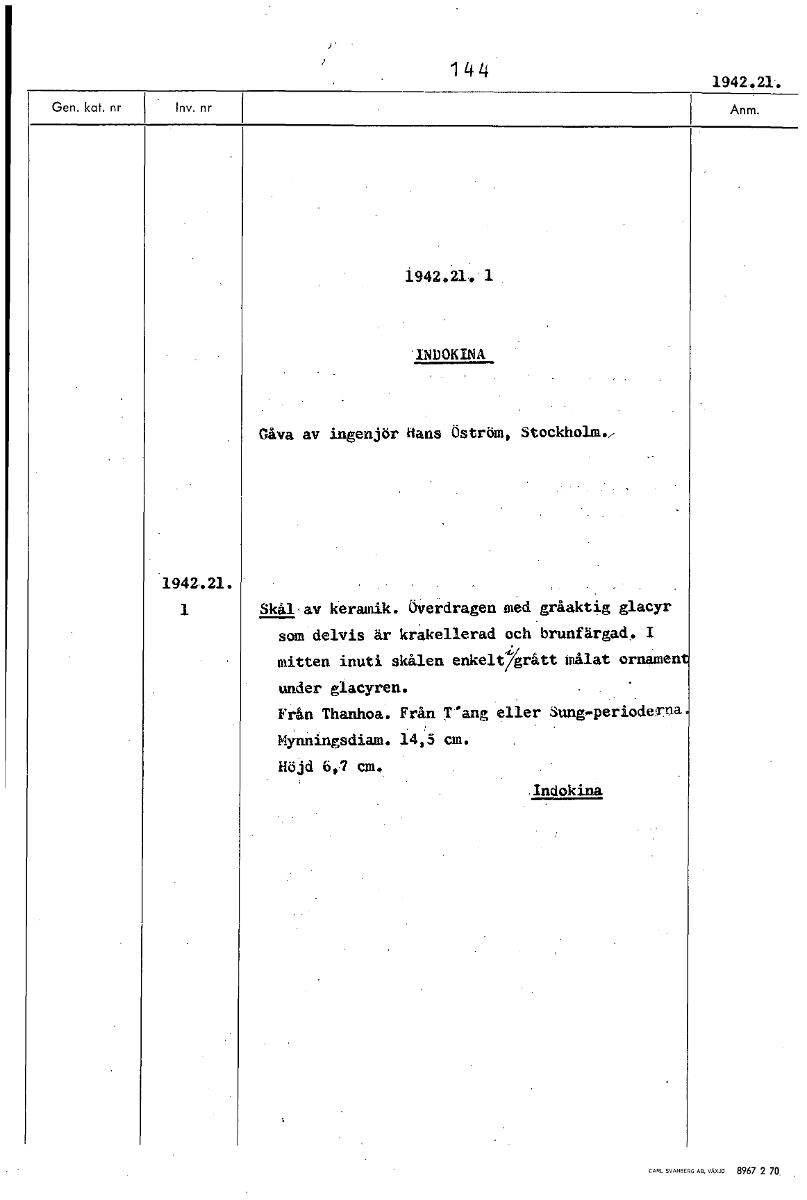 • 144 1942.21. 1942.21.'1 INDOKINA Gåva av ingenjör Hans Öström, Stockholm., 1942.21. 1 Skål•av keramik. Överdragen med gråaktig glacyr som delvis är krakellerad och brunfärgad. I mitten inuti skålen en... Visa hela