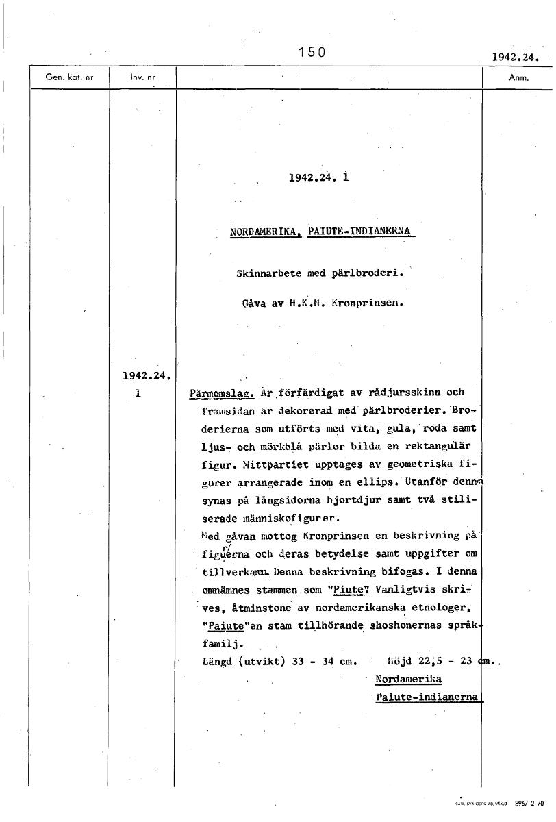 150 1942.24. 1942.24. 1 NORDAMERIKA, PAIUTE-INDIANERNA Skinnarbete med pärlbroderi. Gåva av H.K.H. Kronprinsen. 1942.24, 1 Pärmomslag.1 Ar förfärdigat av rådjursskinn och framsidan är dekorerad med pä...Visa hela