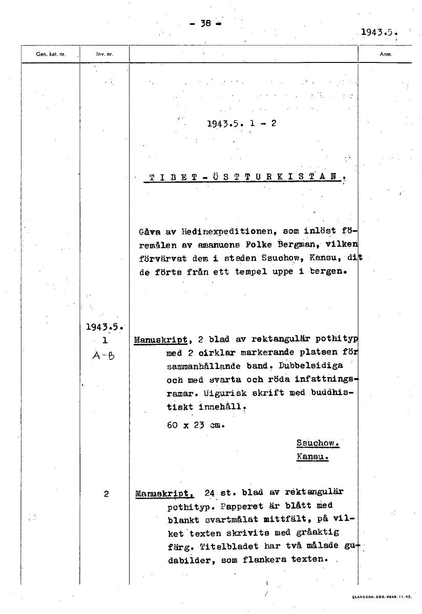 -38- 1.943.5. 1943.5. 1 - 2 TIBET-ÖSTTURKISTAN (Östturkestan). Gåva av Hedinexpeditionen, som inlöst föremålen av amanuens Folke Bergman, vilke förvärvat dem i staden Ssuchow, Kansu, di de förts från ...