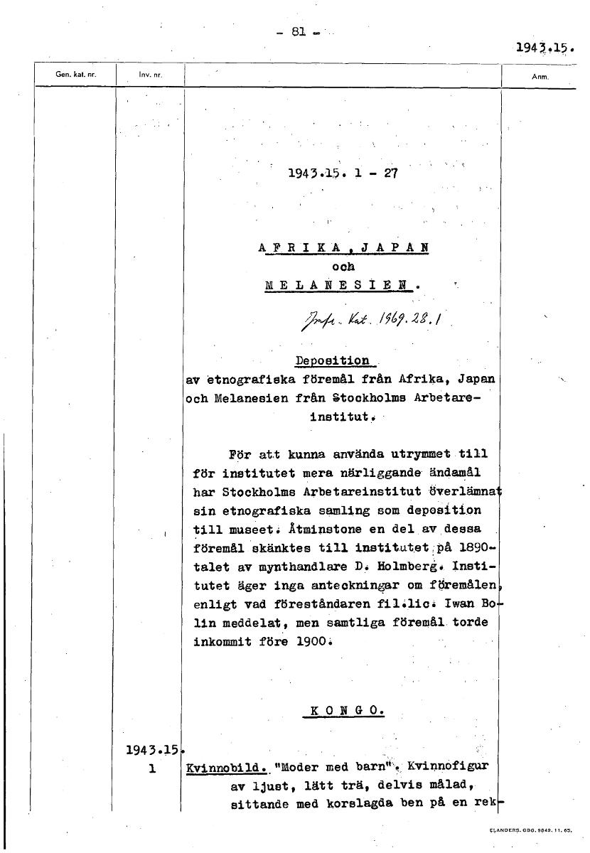 81 1943,45. 1943.15. 1 - 27 AFRIKA JAPAN och MELANESIEN. ,i 4,2c 19f. 2./ !Deposition av etnografiska föremål från Afrika, Japan och Melanesien från Stockholms Arbetare- institut. För att kunna använd...