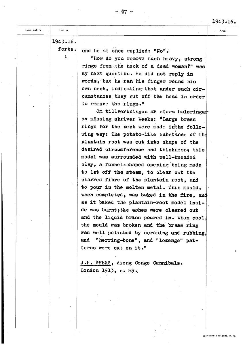 97- 1943.16. 1943 .16 . forts. and he at ohce replied: "No": 1 "How do, you remove such heavy, strong rings from the veck of a dead'woman?" was my next question. lie did not reply in wordai'but he ran his finger round his own neck, indicating. that under such cir- cumstancewthey cut off the head in order to remove the rings." Om tillverkningen av stora halsring av mässing skriver Weeks: "Large brass rings for the neck were made inthe folio- wing way: The potato-like substance of th plantgin root.was'cut into shape of the desired circumference and thickness; this model was surrounded with well-kneaded clay, a funnel-shaped openingbeing made to let off the steam, to 01~ out the charred fibre of the plantgin root, and to polar in the molten metal.. This mould, when completed, was baked in the fire, an as it baked the plantgin-root model insi- de was burntithe ashes were cleared out and the.liquid brass poured in.- When cool the mould was broken and the brass ring was weil polished by scraping and rubbing and "herring-bone", and "lozenge" pat- terns were cut on it." J.H.. WEEKS,, Among Cong() Cannibals. London 1913, s 89 [ocr]