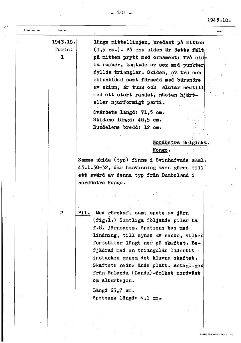 - 101 - 1943.18-.. 1943:18: längs mittellinjen, bredast på mitten forts. (1,5 cm.). På ena sidan är detta fält 1 på mitten prytt med ornament: Två slä ta romber, kantade av sex med punkter fyllda trianglar. Skidan, av trä och skinnklädd samt försedd med bärsnöre av skinn, är tunn och slutar nedtill med ett stort rundat, nästan hjärt- eller njurformigt parti. Svärdets längd: 71,5 cm. Skidans längd: 48,5 cm. Rundelens bredd: 12 cm. Nordöstra %iii k . Kongo. Samma skida (typ) finns i Svinhufvuds saml. 43.1.30-32, där hänvisning även göres till ett svärd av denna typ från Dumboland i nordöstra Kongo. 2 Pil. Med rörskaft samt spets av järn (fig.l.) Samtliga följande pilar ha f.ö. järnspets. Spetsens bas med lindning, till synes av senor, Vilke fortsätter långt ner på skaftet. Be-. fjädrad med en triangulär läderbit - instucken genom det kluvna skaftet. Skaftets nedre ände platt. Antaglige från Balendu (Lendu) -folket nordväst om Albertsjön. Längd 65,7 cm. Spetsens längd: 4,1 om. [ocr]