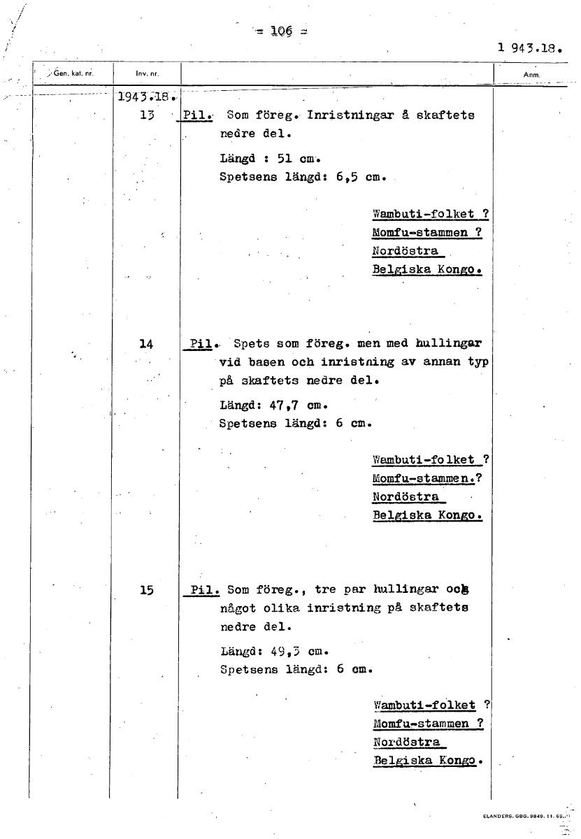 1 943.18. 1943.184 13 Pil.- Som föreg.. inristningar å skaftets nedre del. Längd : 51 cm-. Spetsens längd: 6,5 cm.. Wambuti-folket ? Momfu-stammen ? Nordöstra . Belgiska Kongo. 14 Pil.. Spets som föreg. men med hullingar vid basen och inristning av annan typ på skaftets nedre del. Längd: 47,7 cm. Spetsens längd: 6 cm. Wambuti-folket ? Momfu-stammen.? Nordöstra Belgiska Kongo. 15 Pil. Som föreg., tre par hullingar och något olika inristning på skaftets nedre del. Längd: 49,3 em. Spetsens längd: 6 cm. Wambuti-folket ? Momfu-stammen ? Nordöstra Belgiska Kongo. [ocr]Stäng