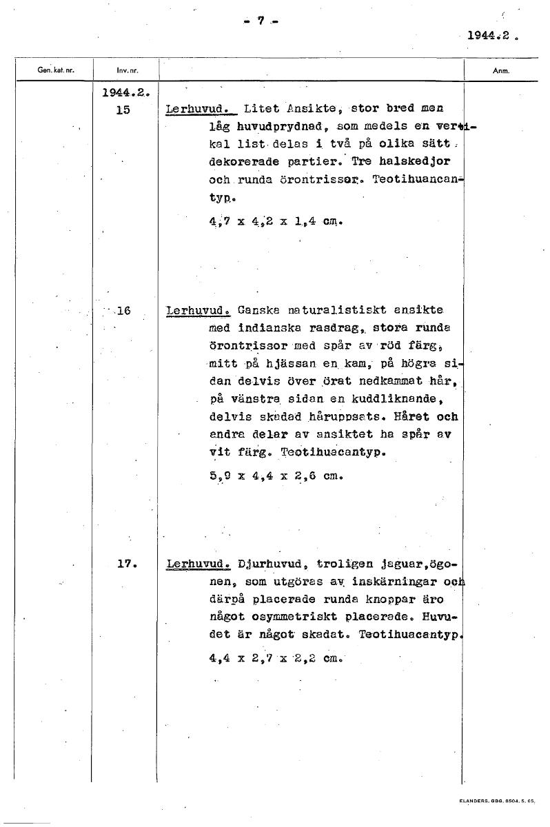 1944.2 1944.2. 15 Lerhuvud. Litet !Ansikte, stor bred men låg huvudprydnad, 50M medels en- Verk kal list delas i två på olika sätt, dekorerade partier. Tre halskedjor och runda örontrissor. Teotihuancan: typ. 4,7 x 4,2 x 1,4 am. Lerhuvud. Ganska naturalistiskt ansikte Med indianska rasdrag, stora runda örontrissor.med spår av röd färg, mitt på hjässan en kam, på högra si dan delvis över firat nedkammat hår, på vänstra sidan en kuddliknande, delvis skådad håruppsats. Håret och andra delar av ansiktet ha spår av Vit färg. Teotihuacantyp. 5,9 x 4,4 2,6 cm. 7. Lerhuvud. Djurhuvud, troligen jaguareögo- nen, som utgöras av inskärningar oc därpå placerade runda knoppar äro något osymmetriskt placerade. Huvu- det är något skadat. Teotihuacantyp 4,4 x 2,7 x.2,2 [ocr]