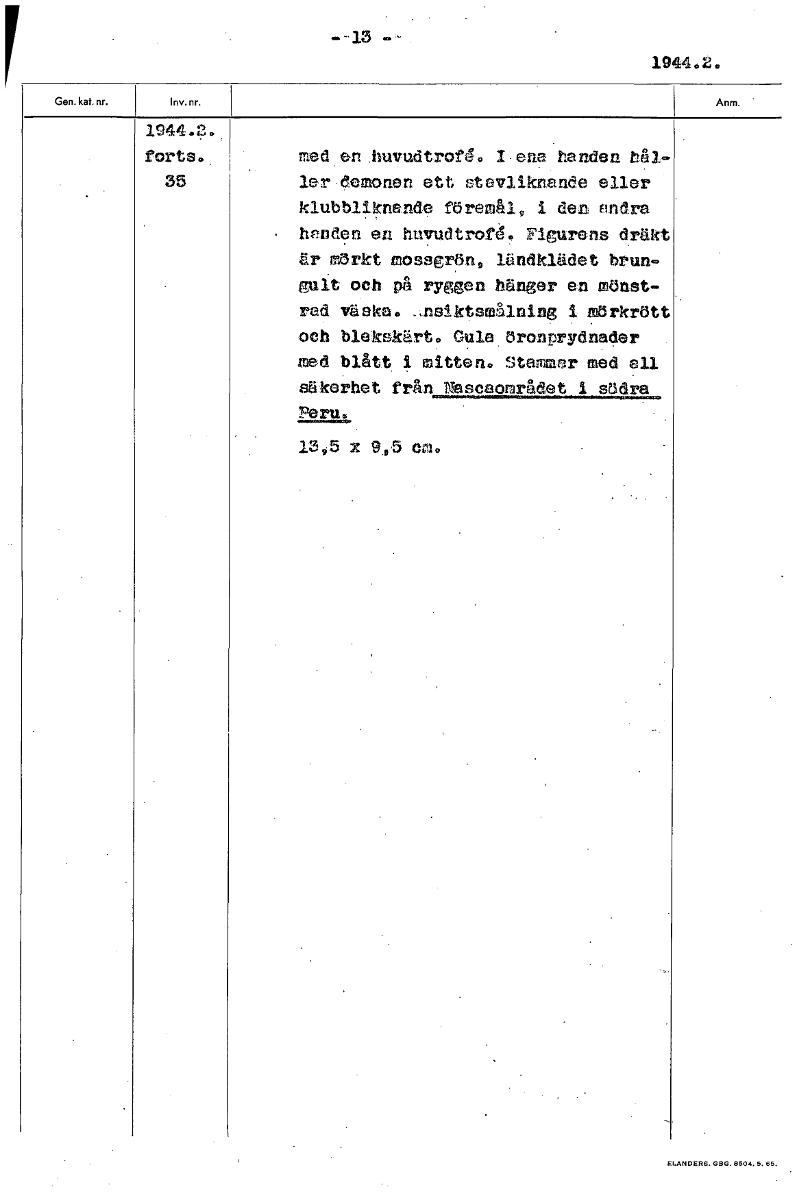 • 1944.2. 1944.p. forts. med er huvudtrofd. lena handen hål- 35 ler demonen ett stevliknande eller klubbliknande föremål, i den andra henden en huvudtrofd. Figurens dräkt är mörkt mossgrön, lindklädet b... Visa hela