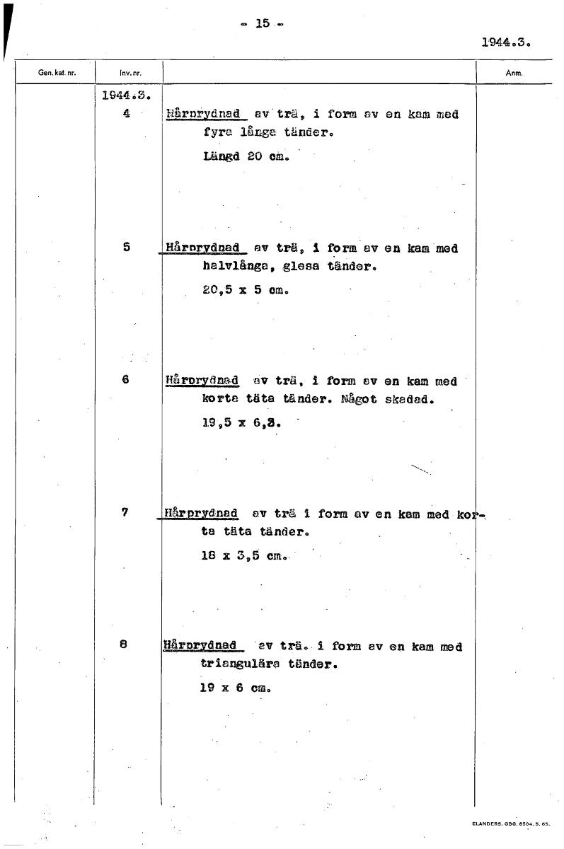 15- 1944.3. 1944.3. 4 hårnrydnad ev trä, i form sv en kam med fyra långa tänder. Längd 20 om. 5 Rårnrvdnad av trä, 1 form sv en kam med halvl&nge, glesa tänder. 2095 x 5 cm. 6 Hårorydnad av trä, 1 form av en kam med korta täta tänder. Något skadad. 1995 x 6,3. 7 Hår r dnad av trä i form av en kam med ko ta täta tänder. 18 x 5,5 em. 8 Hår rydnad ev trå. i form ev en kam med triangulära tänder. 19 x 6 om. [ocr]