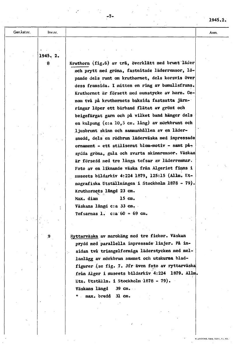 1945.2. 1945. 2. '8 Kruthorn (fig.6) av trä, överklätt med brunt-läder och prytt med gröna, fastnitade läderremsor, lö- pande dels runt om kruthornet, dels korsvis över dess framsida. 1 mitten en ring...