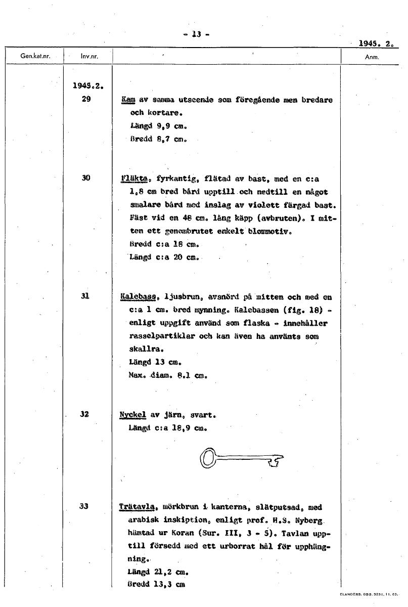 -13- • 1945. 2. 194502. 29 Kam av samma utseende som föregående men bredare och kortare. Längd 9,9 cm. Oredd 8,7 cm. 30 Fläkta, fyrkantig, flät d av bast, med en c:a 1,8 cm bred bård upptill och nedti...