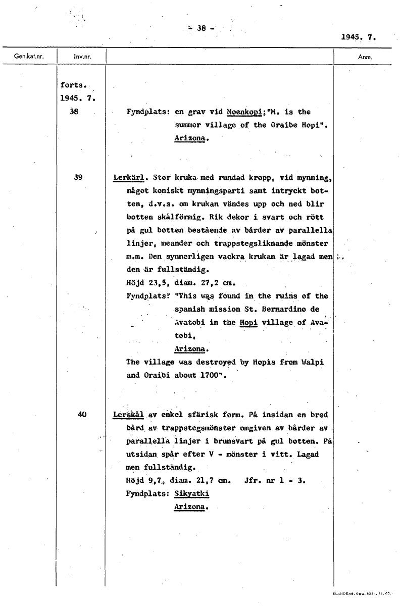 1.38- 1945. 7. forts. 1945. 7. 38 Fyndplats: en grav vid Moenkopi;"M. is the summer village of the Oraibe Hopi". Arizona. 39 Lerkärl. Stor kruka med rundad kropp, vid mynning, något koniskt mynningspa...