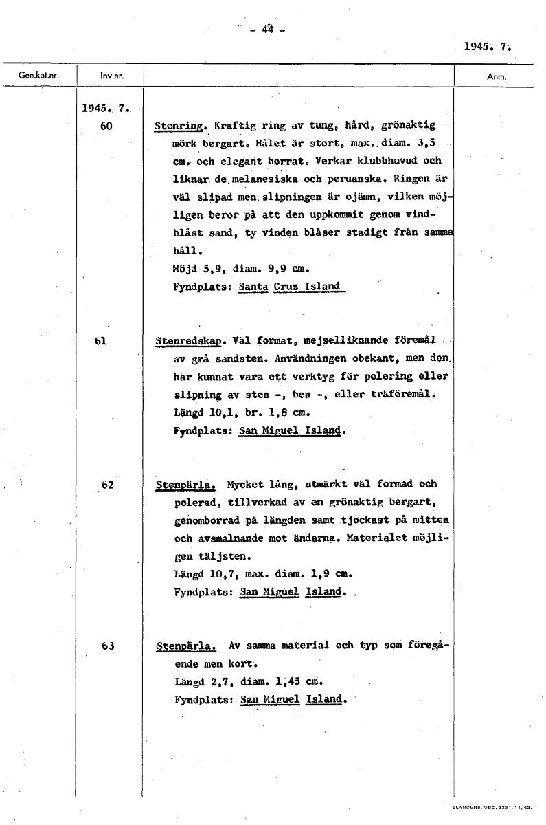 -44- 1945. 60 Stenring. Kraftig ring av tung, hård, grönaktig mörk bergart. Hålet är stort, max. diam. 3,5 cm. och elegant borrat. Verkar klubbhuvud och liknar de melanesiska och peruanska. Ringen är väl slipad men slipningen är ojämn, vilken möljligen beror på att den uppkommit genom vindblåst sand, ty vinden blåser stadigt från samma håll. Höjd 5,9, diam. 9,9 cm. Fyndplats: Santa Cruz Island 61 Stenredskap. Väl format, mejselliknande föremål av grå sandsten. Användningen obekant, men den har kunnat vara ett verktyg för polering eller slipning av sten -, ben -, eller träföremål. Längd 10,1, br. 1,8 cm. Fyndplats: San Miguel Island. 62 Stenpärla. Mycket lång, utmärkt väl formad och polerad, tillverkad av en grönaktig bergart, genomborrad på längden samt tjockast på mitten och avsmalnande mot ändarna. Materialet möjligen täljsten. Längd 10,7, max. diam. 1,9 cm. Fyndplats: San Miguel Island. 63 Stenpärla. Av samma material och typ som föregående men kort. Längd 2,7, diam. 1,45 cm. Fyndplats: San Miguel Island. [ocr]