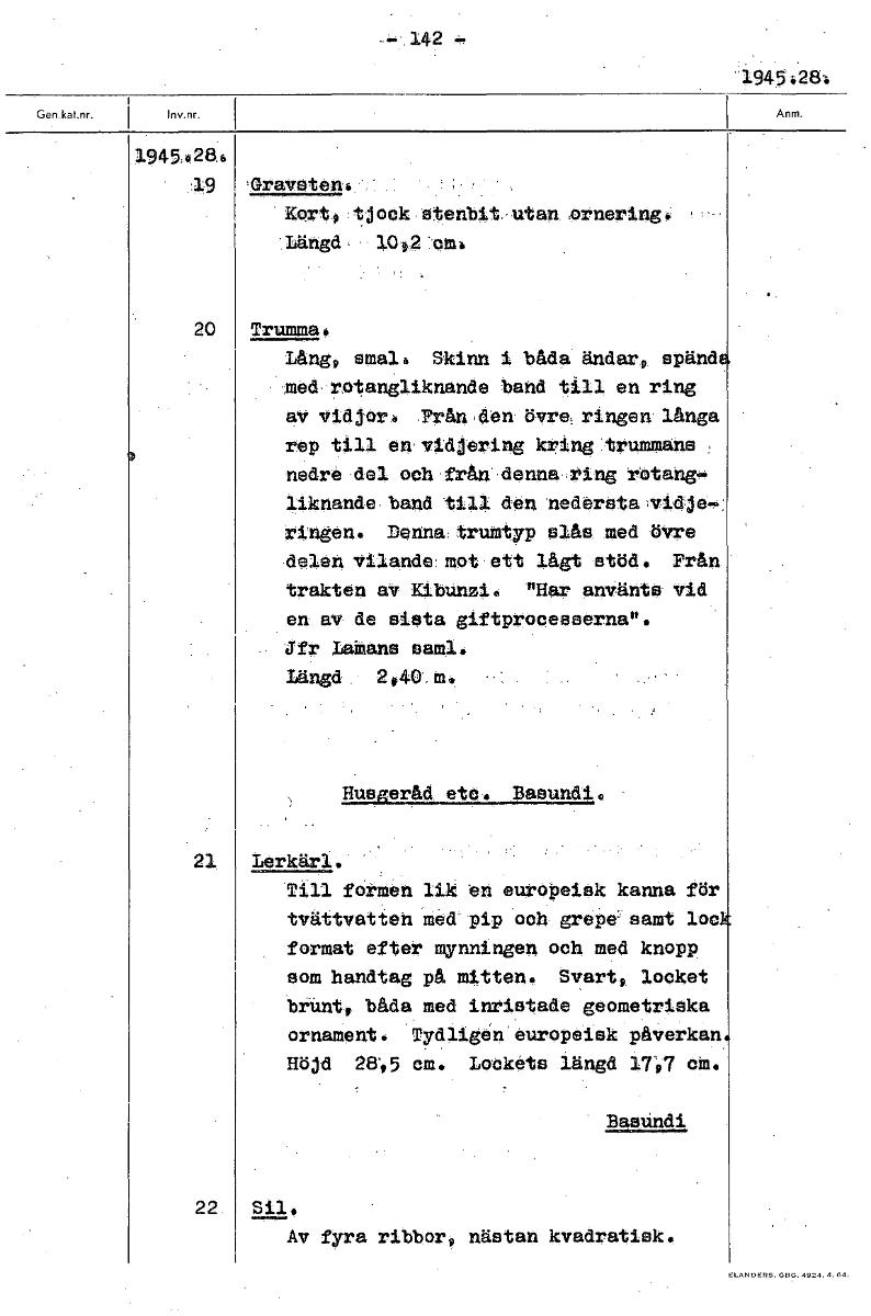 -.142 1945.28. 194528, 19 'Gravsten. • Kort, tjock.stenbit.,utan.ornering, 'Längd,' 10,2 cm. 20 Trumma. Lång, smal. Skinn i båda ändar, spänd med, rotangliknande band till en ring av vidiorb Från en ö...