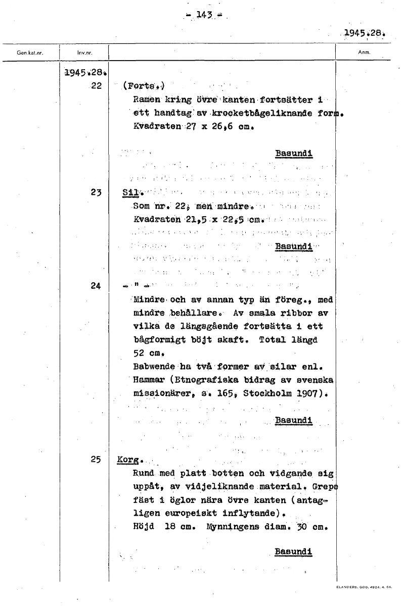 ,143, -1945.28. i945 48t .22 (Porte.) Ramen kring öVre'kanten fortsätter i ett handtag av krocketbågeliknande for Kvadraten-27 x 26,6 om. Basundi 23 Som nr. 229 men ,mindre Kvadraten '21,5,x '22,5 iom. Basundi 24 Mindre och av annan typ än föreg., med mindre tehållare. Av smala ribbor av vilka de längsgående fortsätta i ett bågformigt böjt skaft. Total längd 52 cm. Babwende ha två former aV:eilar enl. Hammar (Etnografiska bidrag av svenska missionärer, s. 165, Stockholm 1907). Basundi 25 14Crg. Rund med platt botten och vidgande sig uppåt, av vidjeliknande material. Grep fäet i öglor nära övre kanten (antag- ligen europeiskt inflytande). Höjd 18 cm. Mynningens diam. 30 cm. Basundi [ocr]
