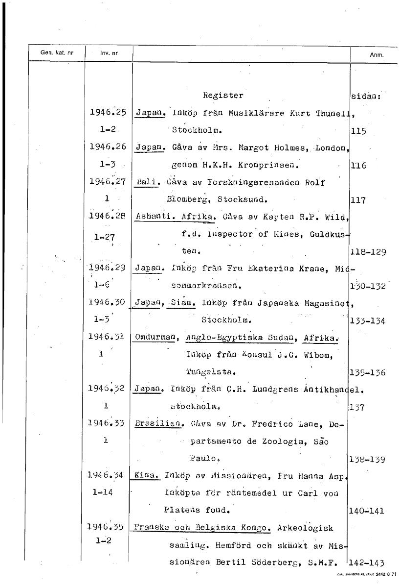 Register sidan: 1946.25 Japan. Inköp från Musiklärare Kurt Thunell 1-2 Stockholm. 115 1946.26 Japan. Gåva av. års. Margot Holmes,. London, 1-3 genom H.K.H. Kronprinsen, 116 - 1946.27 Bali. Gåva av For...