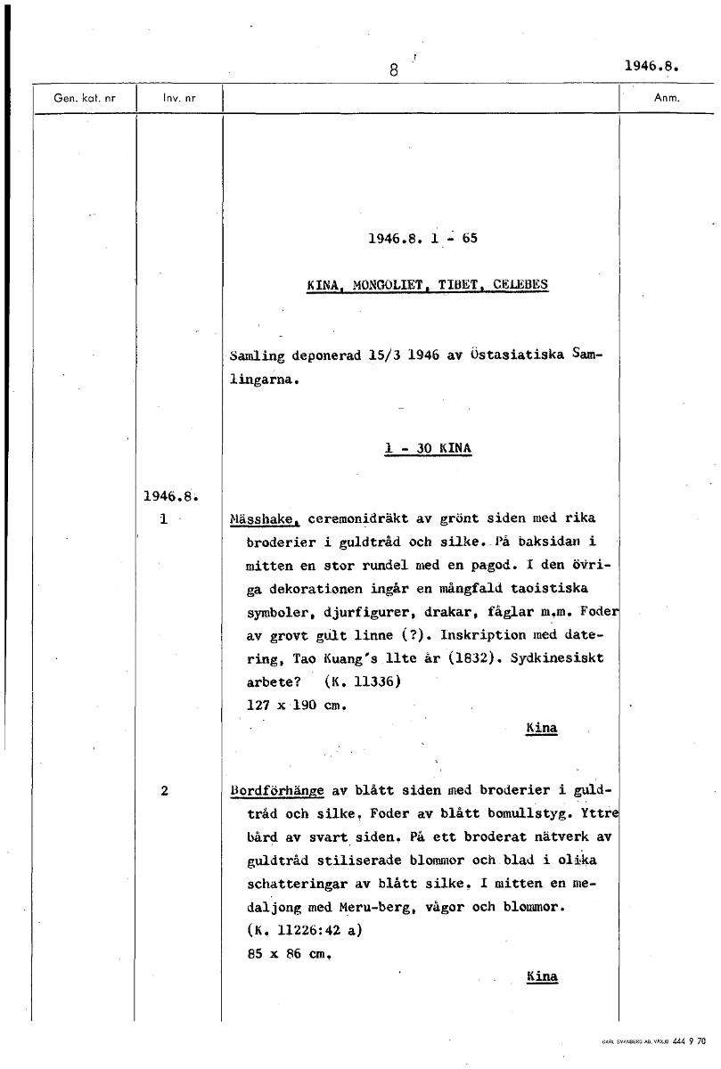 1946.8. 1946.8. 1 - 65 KINA, MONGOLIET, TIBET, CELEBES Samling deponerad 15/3 1946 av Östasiatiska Sam- lingarna. 1 - 30 KINA 1946.8. 1 • Mässhake, ceremonidräkt av grönt siden med rika broderier i gu...