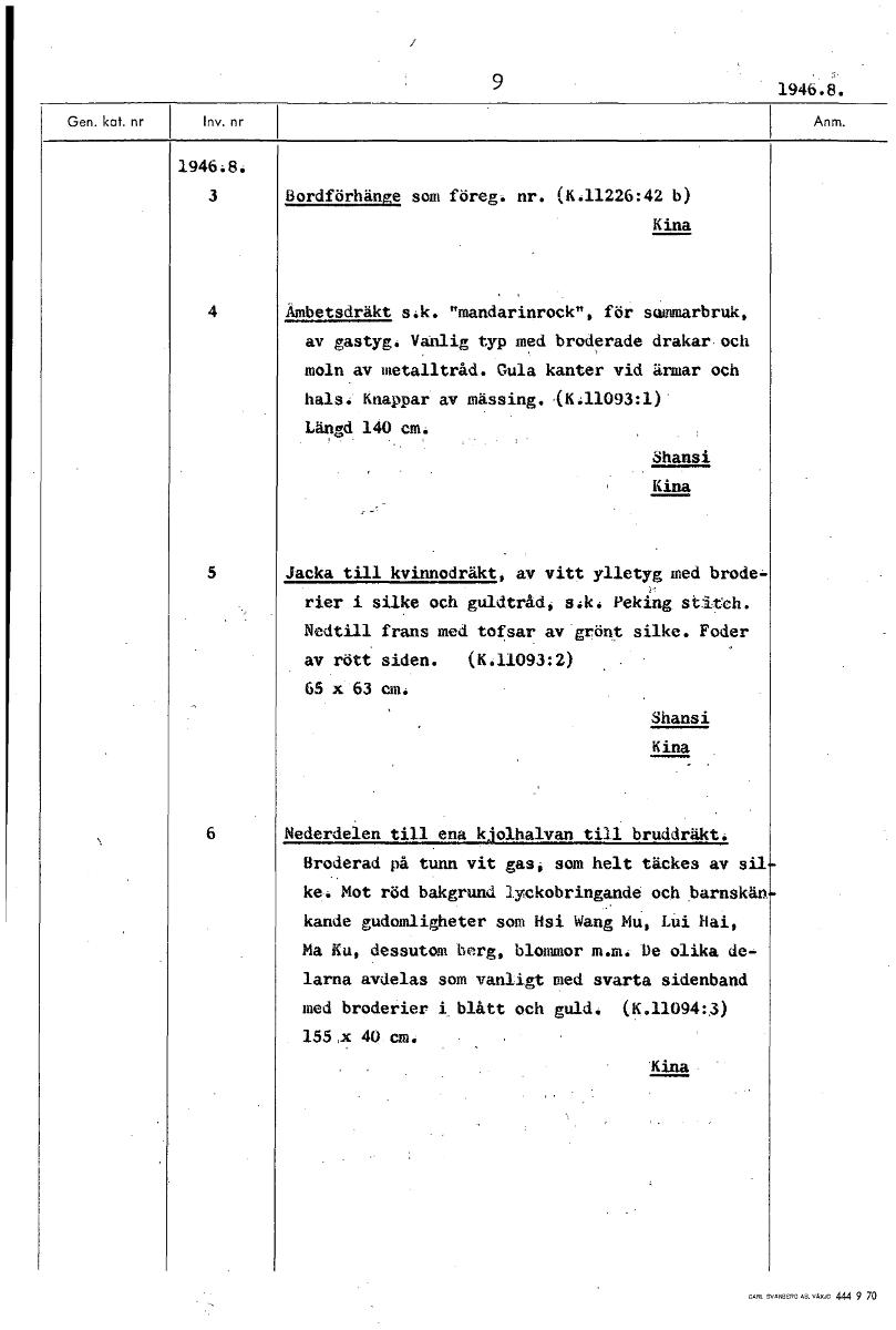 9 1946.8. 1946.8. 3 Bordförhänge som föreg. nr. (K.11226:42 b) Kina 4 Ämbetsdräkt s.k. "mandarinrock", för sommarbruk, av gastyg. Vanlig typ med broderade drakar och moln av metalltråd. Gula kanter vi...