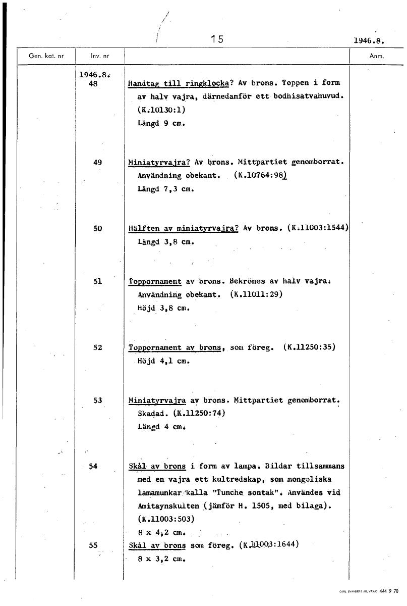 15 1946.8. 1946.8: 48 Handtag till ringklocka? Av brons. Toppen i form av halv vajra, därnedanför ett bodhisatvahuvud. (K.10130:1) Längd 9 cm. 49 Miniatyrvajra? Av brons. Mittpartiet genomborrat. Anvä...