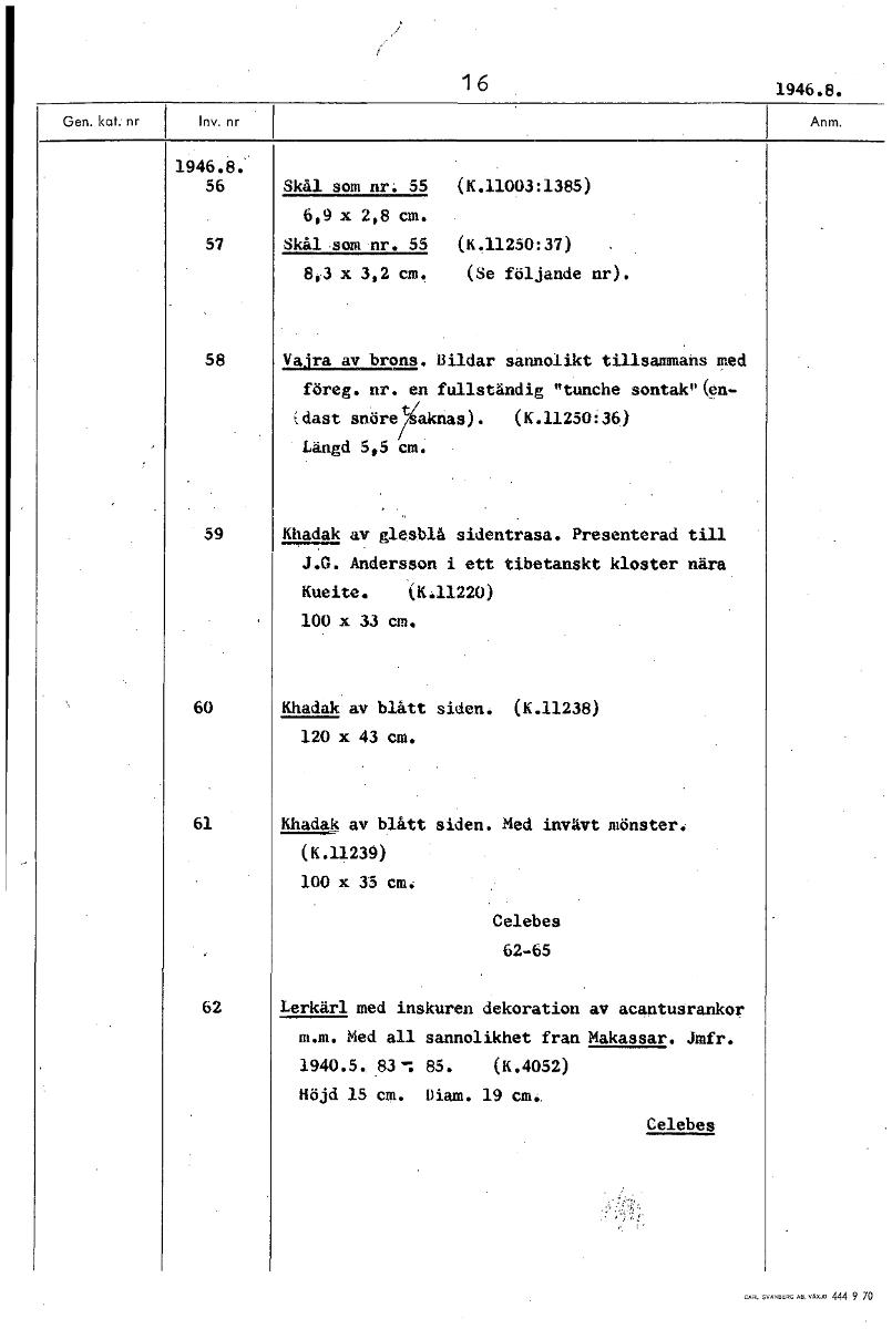 16 1946.8. 1946.8. 56 Skål som nr. 55 (K.11003:1385) 6,9 x 2,8 cm. 57 Skål som nr. 55 (K.11250:37) 8,3 x 3,2 cm. (Se följande nr). 58 Vajra av brons. Bildar sannolikt tillsammans med föreg. nr. en fullständig "tunche sontak"(en- tdast snörelÅaknas). (K.11250:36) Längd 5,5 cm. 59 Khadak av glesblå sidentrasa. Presenterad till J.G. Andersson i ett tibetanskt kloster nära Kueite. (K.11220) 100 x 33 cm. 60 Khadak av blått siden. (K.11238) 120 x 43 cm. 61 Khadak av blått siden. Med invävt mönster. (K.11239) 100 x 35 cm. Celebes 62-65 62 Lerkärl med inskuren dekoration av acantusrankor m.m. Med all sannolikhet fran Makassar. Jmfr. 1940.5. 83: 85. (K.4052) Höjd 15 cm. Diam. 19 cm. Celebes [ocr]