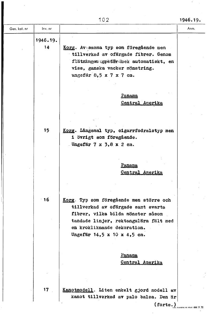 102 1946.19. 1946.19. 14 Una. Avsamma typ som föregående men tillverkad av ofärgade fibrer. Genom flätniinggrugpstärbek automatiskt, en viss, ganska vacker mönstring. ungefär 8,5 x 7 x 7 cm. Panama Central Amerika 15 6m. Långsmal typ, cigarrfodralstyp men i övrigt som föregående. Ungefär 7 x 3,8.x 2 cm. Panama Central Amerika 16 Korg. Typ som föregående men större och tillverkad av ofärgade samt svarta fibrer, vilka bilda mönster såsom tandade linjer, rektangulära fält med en krokliknande dekoration. Ungefär 14,5 x 10 x 4,5 cm. Panama Central Amerika 17 Kanotmodell. Liten enkelt gjord modell av kanot tillverkad av palo balsa. Den är (forts.) [ocr]