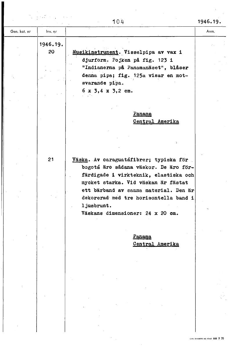 10 4 1946.19. 1946.19. 20 Musikinstrument. Visselpipa av vax i djurform. Pojken på fig. 123 i "Indianerna på Panamanäset", blåser denna pipa; fig. 125a visar en mot- svarande pipa. 6 x 3,4 x 3,2 cm. Panama Central Amerika 21 Väska. Av caraguatåfibrer; typiska för bogotå äro sådana väskor. De äro för- färdigade i virkteknik, elastiska och mycket starka. Vid väskan är fästat ett bärband av samma material. Den är dekorerad med tre horisontella band i ljusbrunt. Väskans dimensioner: 24 x 20 cm. Panama Central Amerika [ocr]Stäng