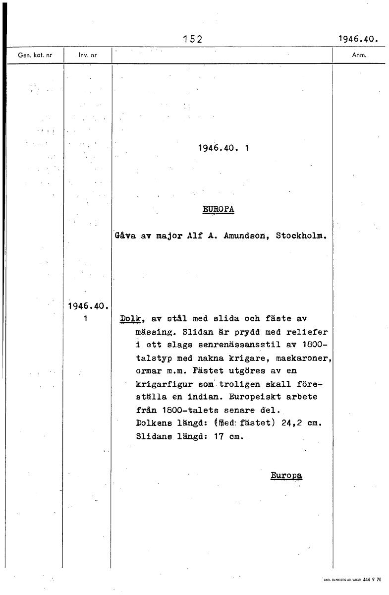 • 152 1946.40. 1946.40. 1 EUROPA Gåva av major Alf A. Amundson, Stockholm. 1946.40. 1 Dolk, av stål med slida och fäste av mässing. Slidan är prydd med reliefer i ett slags senrenässansstil av 1800- tal... Visa hela