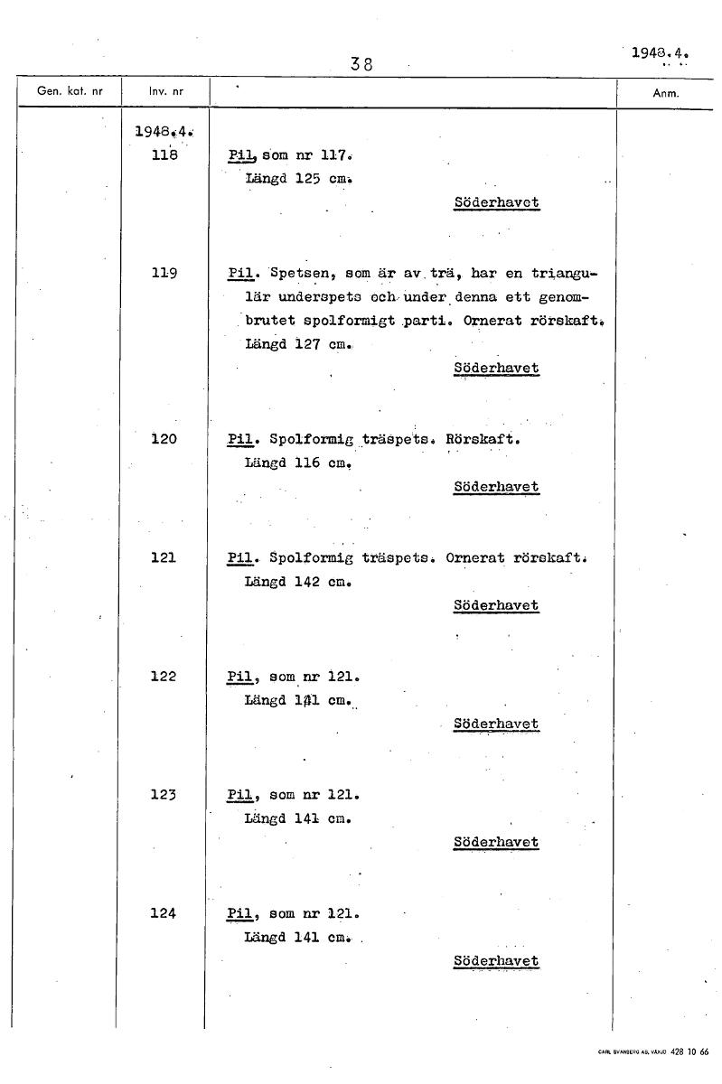 1948.4. 38 1948:4: 118 1212aom nr 117. Längd 125 cm: Söderhavet 119 Pil. Spetsen, som är av trä, har en triangu- lär underspets och,under,denna ett genom- brutet spolformigt parti. Ornerat rörskaft. L...