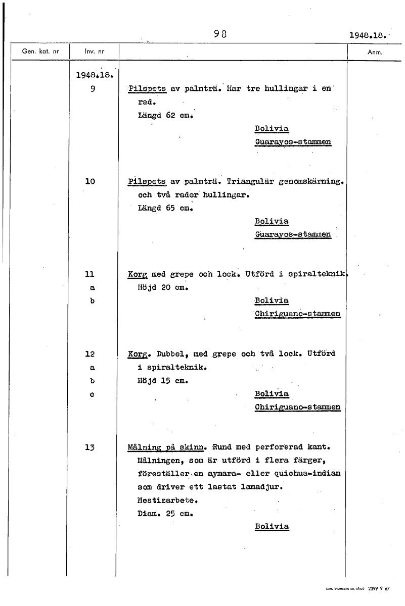 9 8 1948.18. 1948.18. 9 Pilspets av palmträ. Har tre hullingar i en rad. Längd 62 cm. Bolivia Guaravos-stammen 10 Pilspets av palmträ. Triangulär genomskärning. och två rader hullingar. Längd 65 em, Bolivia GUarayos-stammen 11 Korg med grepe och lock. Utförd i spiralteknik a Höjd 20 cm. b Bolivia Chiri ano-stammen 12 Korg,. Dubbel, med grepe och två lock. Utförd a i spiralteknik. b Höjd 15 cm. c Bolivia Chiriguano-stammen 13 Målning på skinn. Rund med perforerad kant. Målningen, som är utförd i flera färger, föreställer en aymara- eller quichua-indian som driver ett lastat lamadjur. Hestizarbete. Diam. 25 cm. Bolivia [ocr]Stäng
