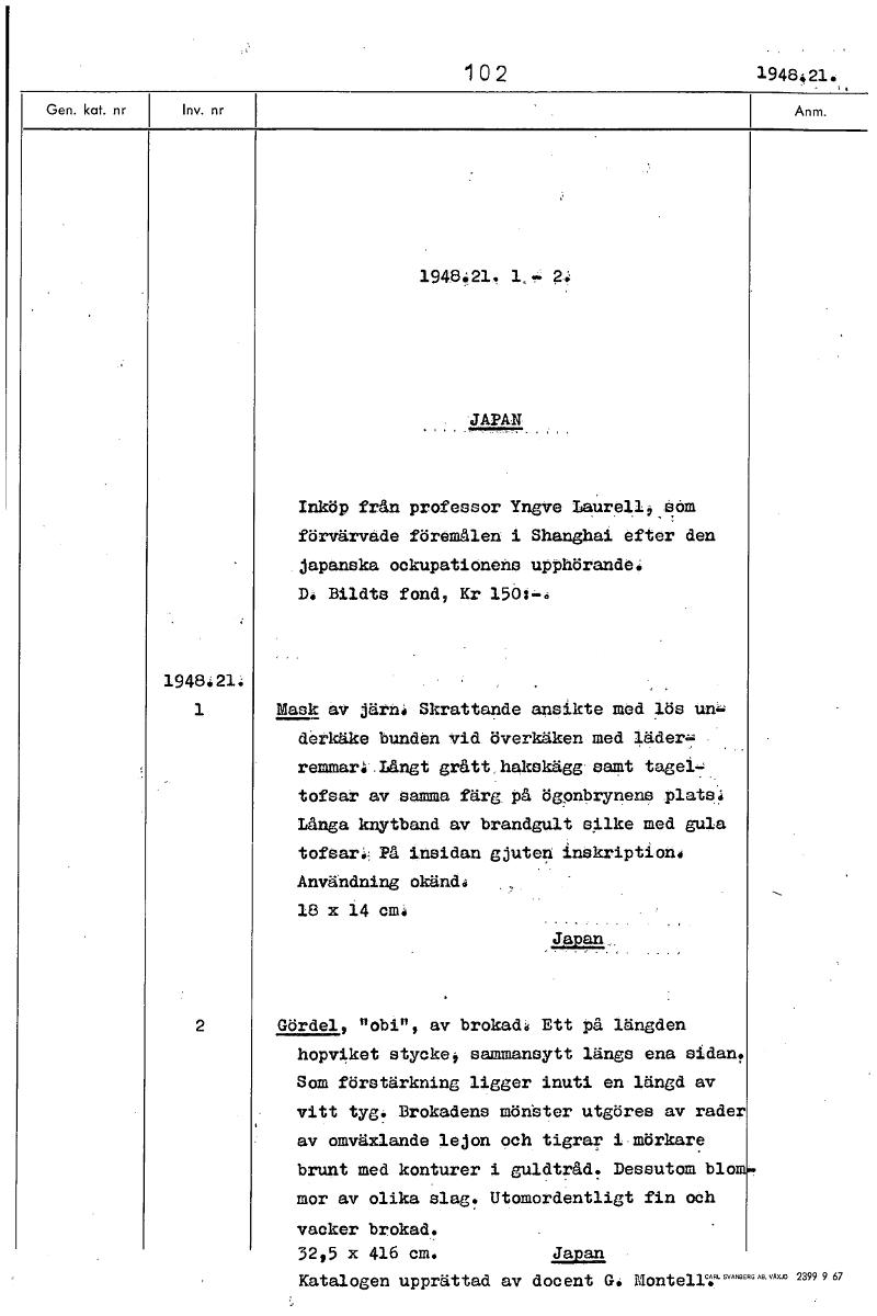 102 1948:21.,, 1948.21. 1, JAPAN Inköp från professor YngVe Laurell? söm förVärvade föremålen i Shanghai efter den japanska ockupatiOnens upphörande: Då Bildt° fond, Kr 150t.;-. 1 Mask av järn: Skratt...